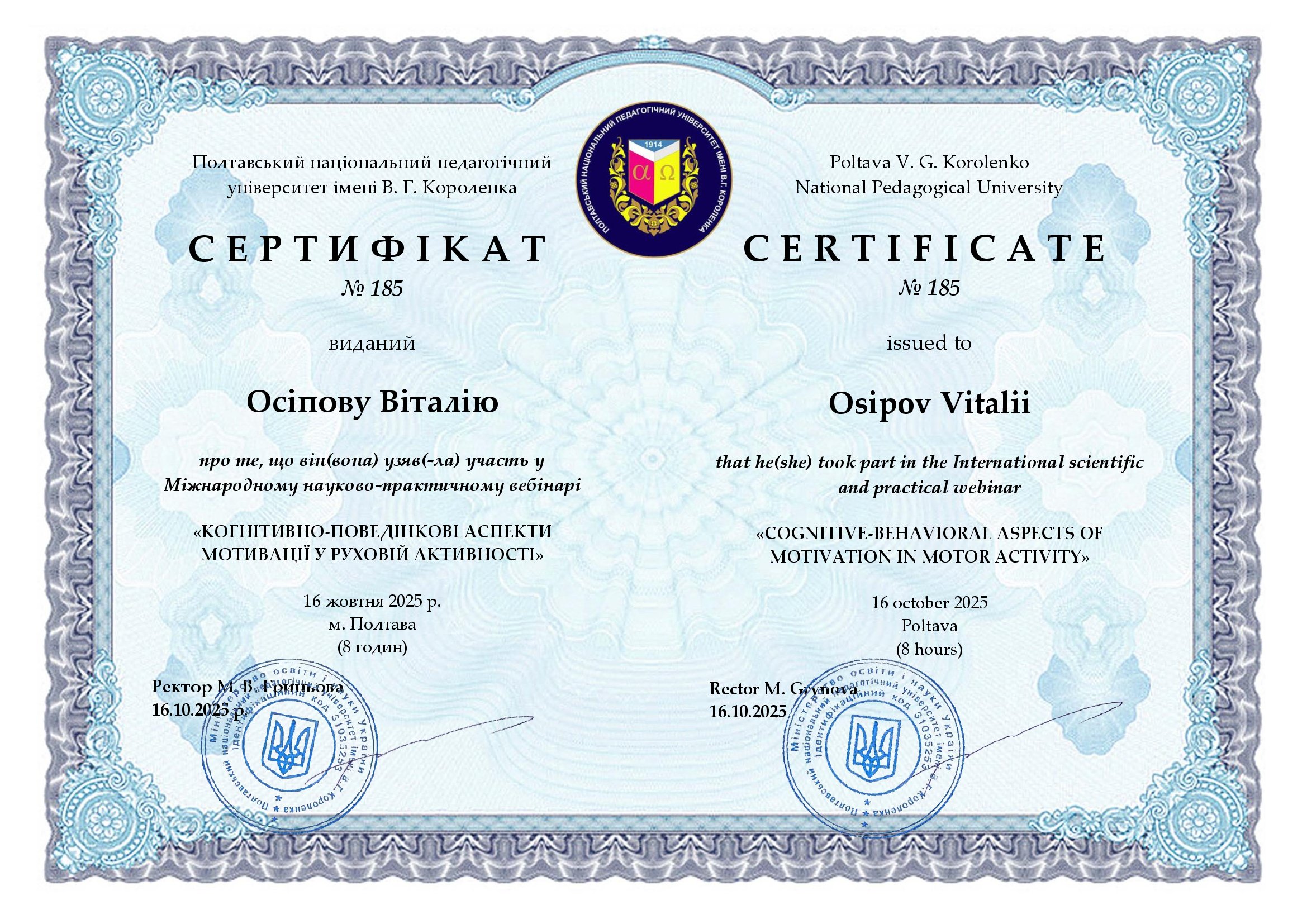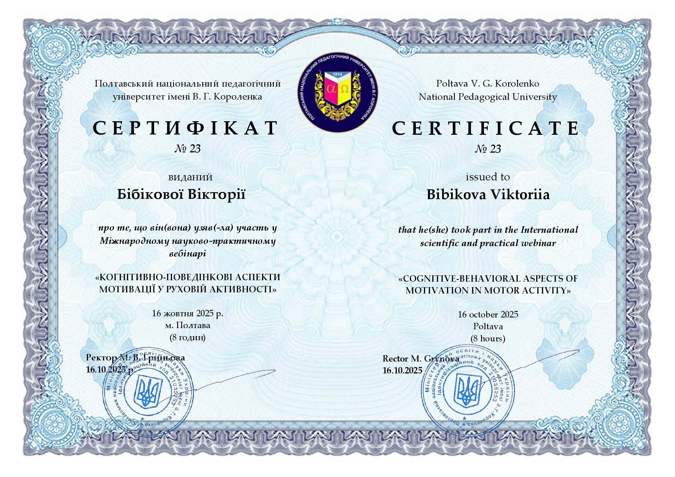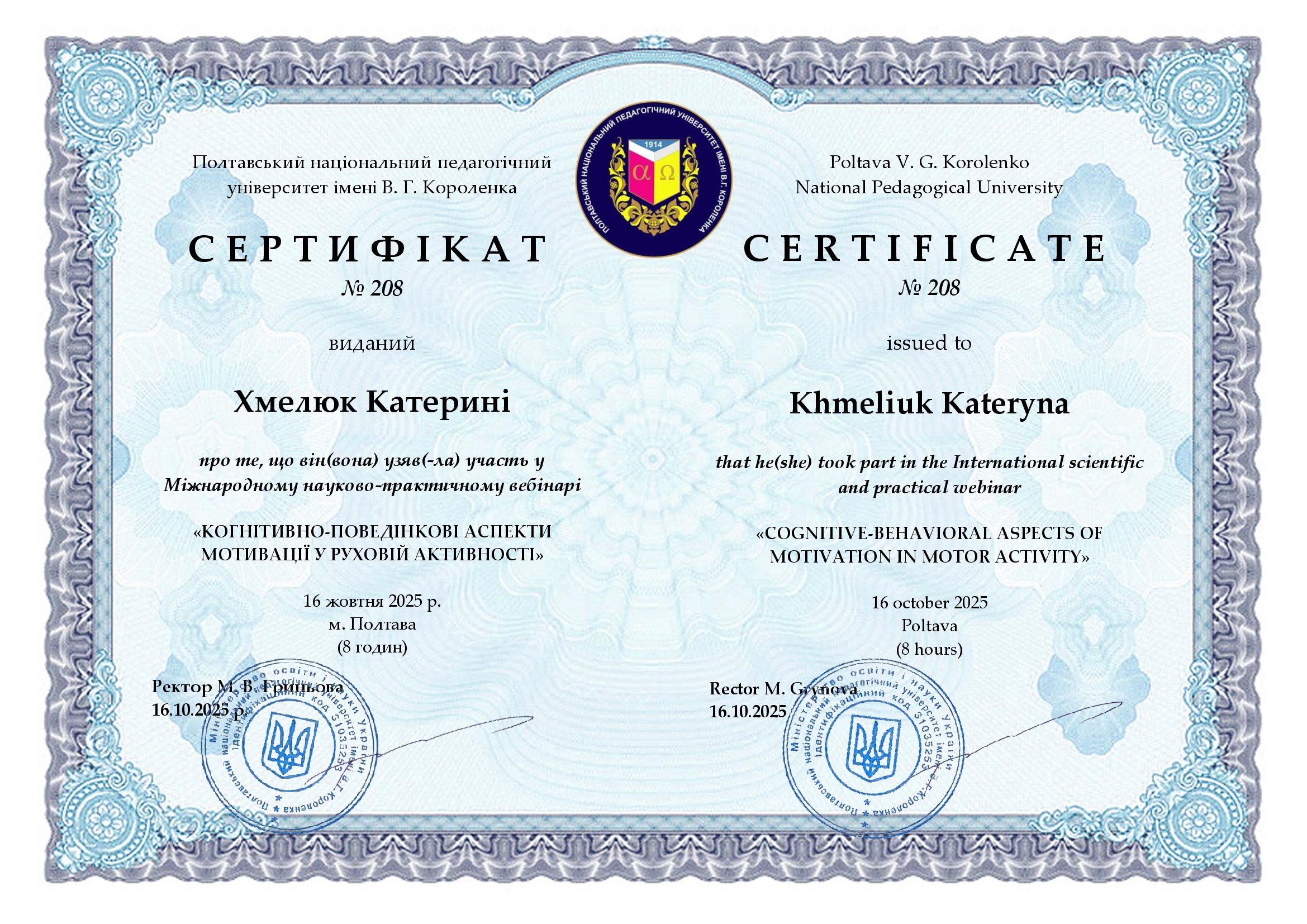 Участь у науково-практичному вебінарі на тему «Когнітивно-поведінкові аспекти мотивації у руховій активності»