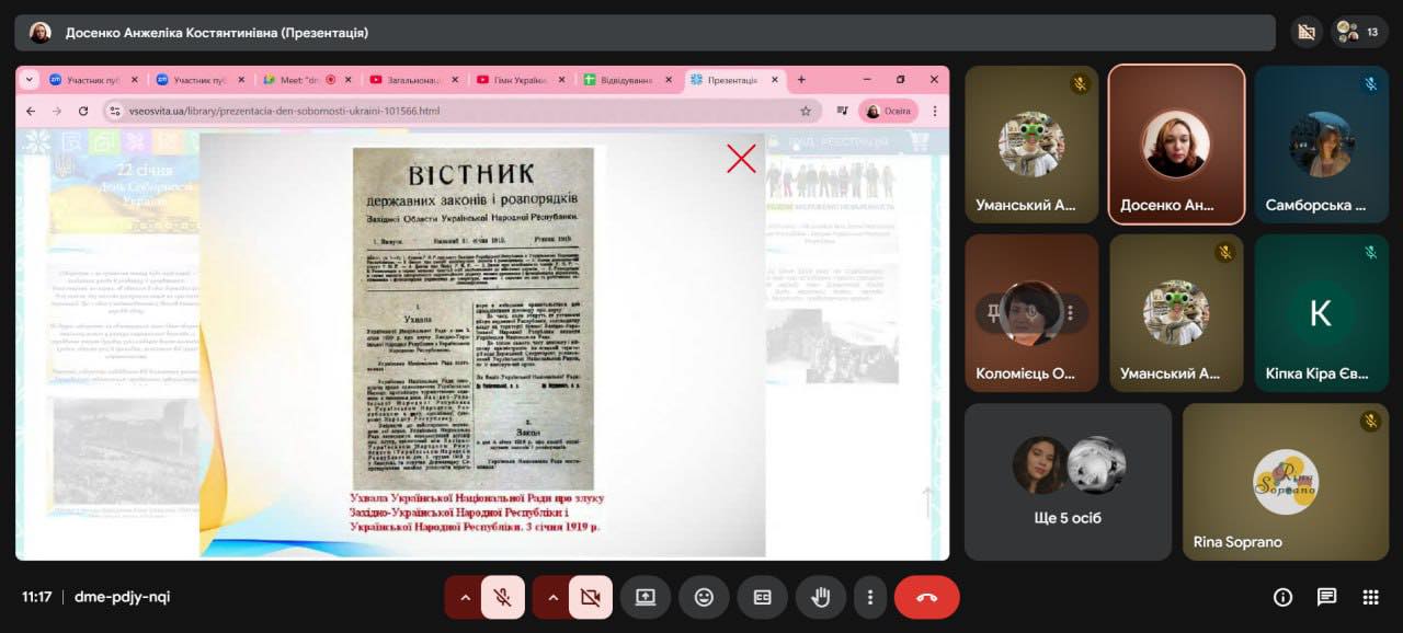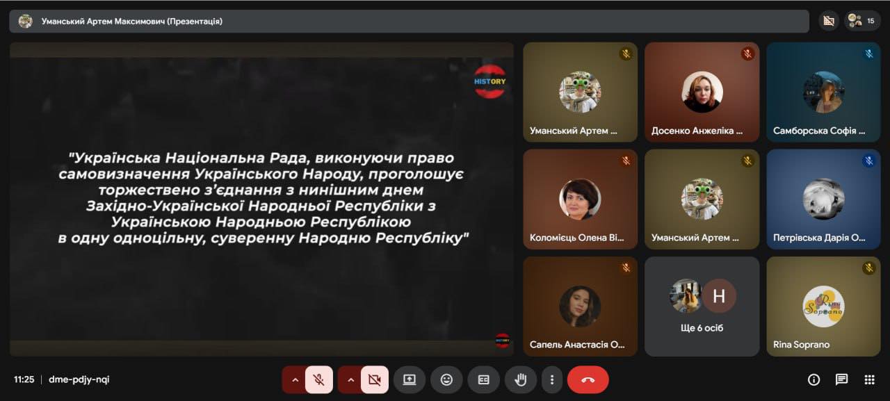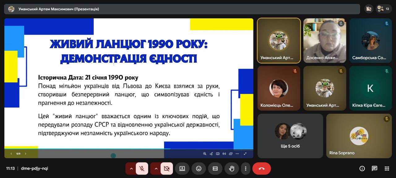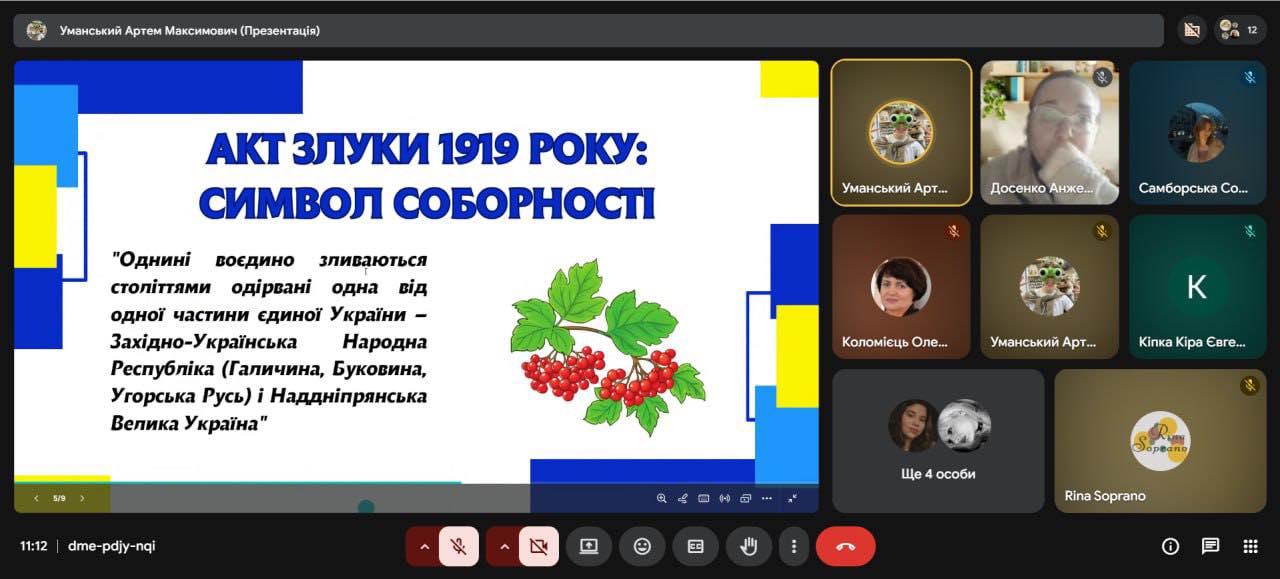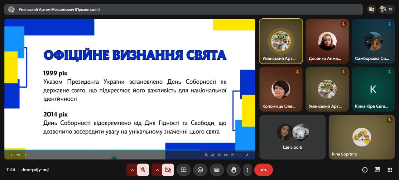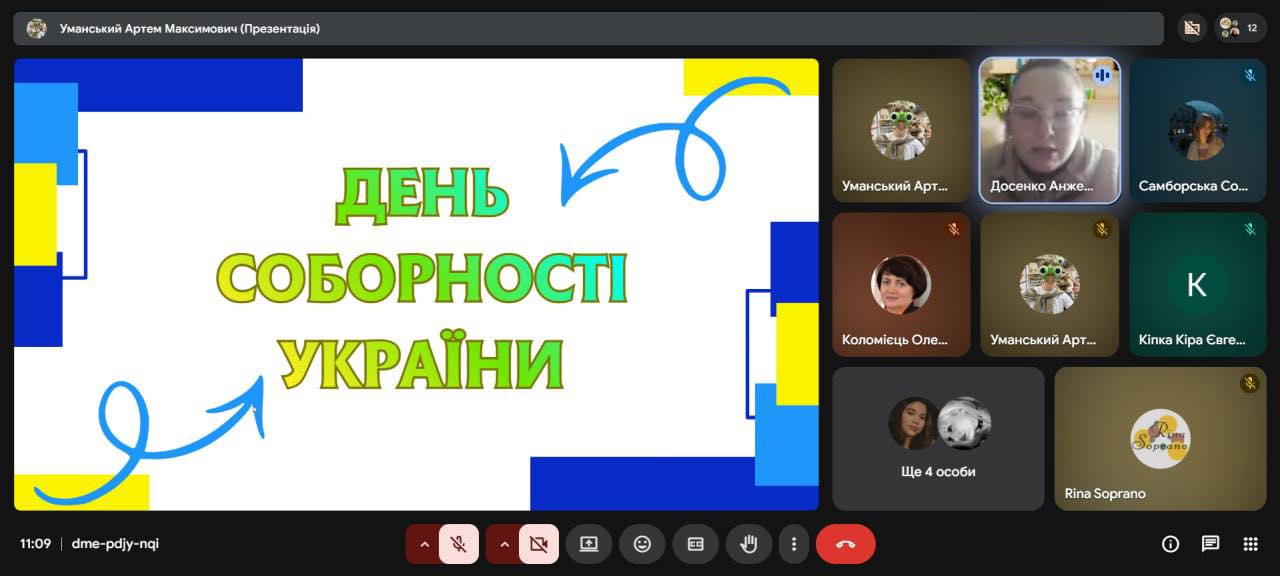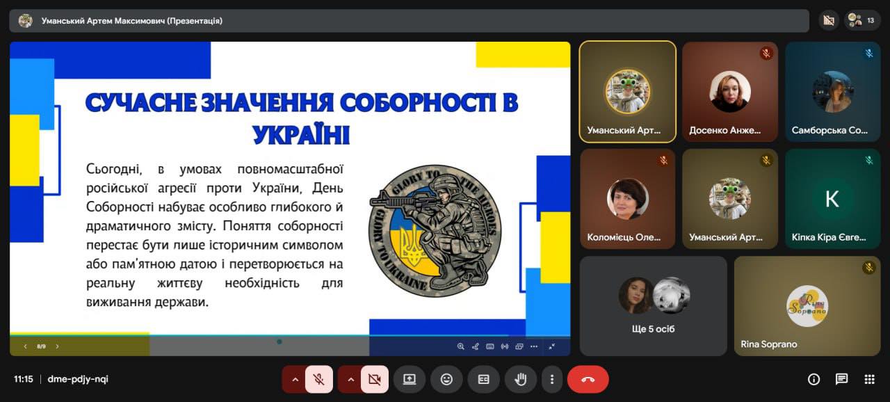 20 січня ННІ ФіЖ провели захід, присвячений Дню Соборності України на який були запрошені викладачі та студенти інституту. Організатором стали студент кафедри журналістики Артем Уманський та завідувачка кафедри Анжеліка Досенко. Головною темою для обговорення стали історичні віхи становлення свята: офіційне визнання, сучасне значення Соборності в Україні, День Соборності як свято єдності та визнання. Також увага приділялась історичному розвиткові подій та актуальним паралелям сьогодення між рф та Україною, адже країна-агресор і наразі не дає змоги нашому народу на спокійне життя. Окреме місце у зустрічі мали рефлексії та теплі слова від викладачів та студентів по завершенню зустрічі (особлива подяка Олені Коломієць).
