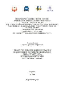 МАТЕРІАЛИ КОНФЕРЕНЦІЙ 2024 2024 2025 СТРАТЕГІЯ РОЗВИТКУ АГРОВОЛЬТАЇКИ:СТАН, ВИКЛИКИ ТА КРОКИ ВПРОВАДЖЕННЯ В УКРАЇНІ Матеріали міжнародної міжгалузевої конференції м. Київ, 8 квітня 2025 року 2024 ТЕОРЕТИКО-ПРАКТИЧНІ ЗАСАДИ УПРАВЛІННЯ, ЕКОНОМІКИ ТА ПРИРОДОКОРИСТУВАННЯ: АСПЕКТИ РЕІНТЕГРАЦІЇ КРИМУ В ГОСПОДАРСЬКИЙ КОМПЛЕКС УКРАЇНИ14 листопада 2024 року МАТЕРІАЛИ VIII МІЖНАРОДНОЇ НАУКОВО-ПРАКТИЧНОЇ КОНФЕРЕНЦІЇ СЕРТИФІКАТ УЧАСНИКА УКРАЇНСЬКИЙ КРИМ: 10 РОКІВ ОКУПАЦІЇ20 лютого 2024 рокуЗБІРНИК МАТЕРІАЛІВ МІЖНАРОДНОГО КРУГЛОГО СТОЛУ ПРАКТИЧНІ ПИТАННЯ ФУНКЦІОНУВАННЯІ ВІДНОВЛЕННЯ ОБ’ЄКТІВ МУНІЦИПАЛЬНОЇІНФРАСТРУКТУРИ ТАПРОМИСЛОВОСТІ УКРАЇНИВ СУЧАСНИХ УМОВАХ6 грудня 2024 року Збірник матеріалів ІІ всеукраїнської науково-практичної конференції 2023 Матеріали всеукраїнської науково-практичної конференції “ПРАКТИЧНІ ПИТАННЯ ФУНКЦІОНУВАННЯ І ВІДНОВЛЕННЯ ОБ’ЄКТІВ МУНІЦИПАЛЬНОЇ ІНФРАСТРУКТУРИ ТА ПРОМИСЛОВОСТІ УКРАЇНИ В СУЧАСНИХ УМОВАХ” (16 – 17 листопада 2023 року) Матеріали VII міжнародної науково-практичної конференції “ТЕОРЕТИЧНІ АСПЕКТИ ТА ПРАКТИЧНІ ПРОБЛЕМИ УПРАВЛІННЯ, ЕКОНОМІКИ ТА ПРИРОДОКОРИСТУВАННЯ В УКРАЇНІ” (Київ, 2-3 листопада 2023 р.) Відповідальний за інформаційне наповнення сторінки: завідувачі кафедр