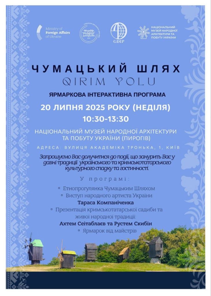 20 липня 2025 року в Національному музеї народної архітектури та побуту України (Пирогів) відбудеться яскрава культурна подія — інтерактивна програма “Чумацький Шлях / QIRIM YOLU”, що триватиме з 09:00 до 18:00 на території Співочого поля.