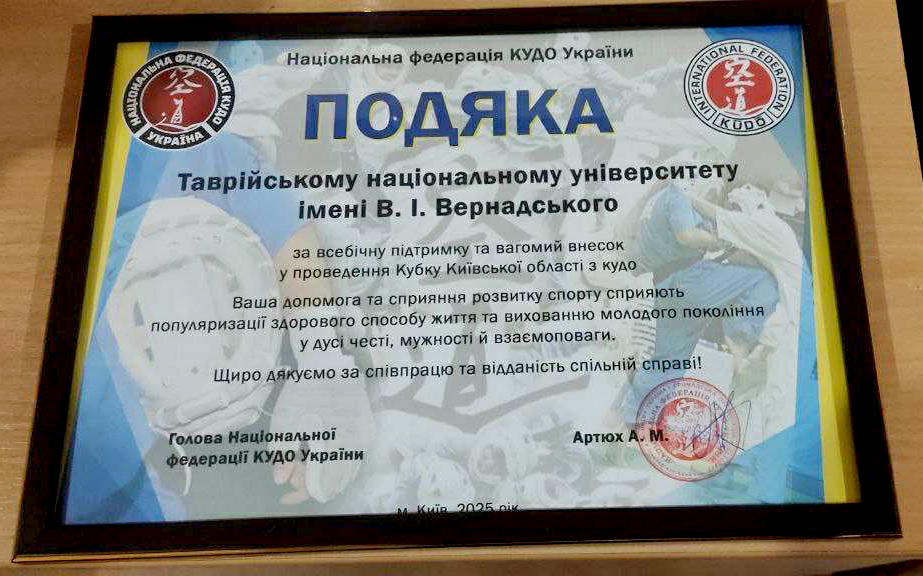 За вагомий внесок у проведення Кубку Київської області з Кудо – 2025 університет був відзначений подякою Національної федерації КУДО України — як знак визнання за всебічну підтримку, партнерство і відданість справі виховання молодого покоління у дусі честі, мужності й взаємоповаги.