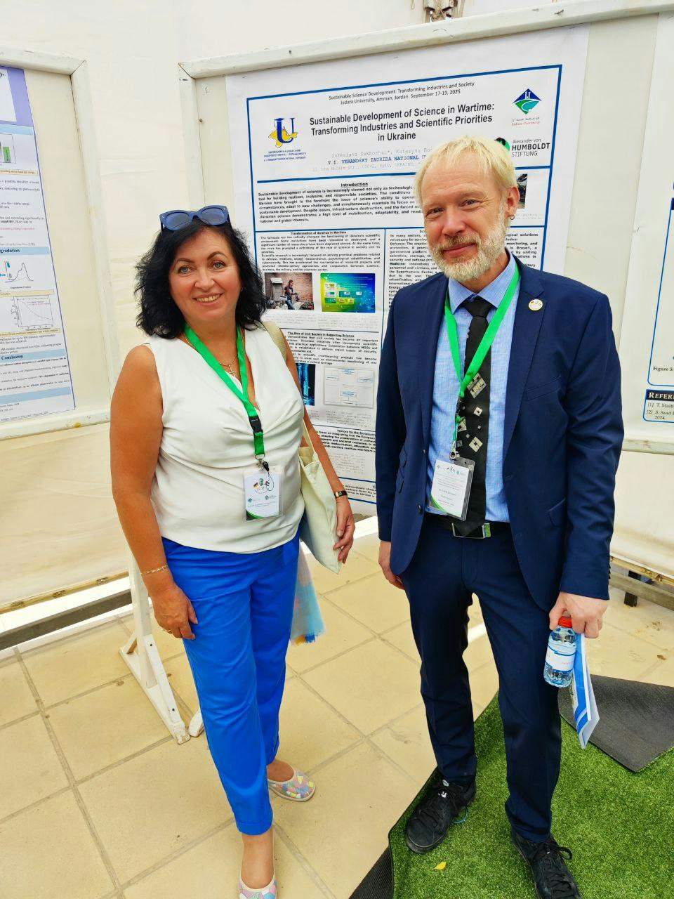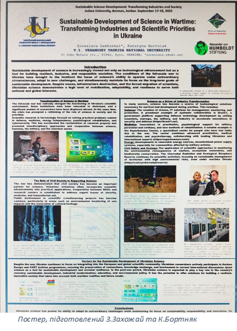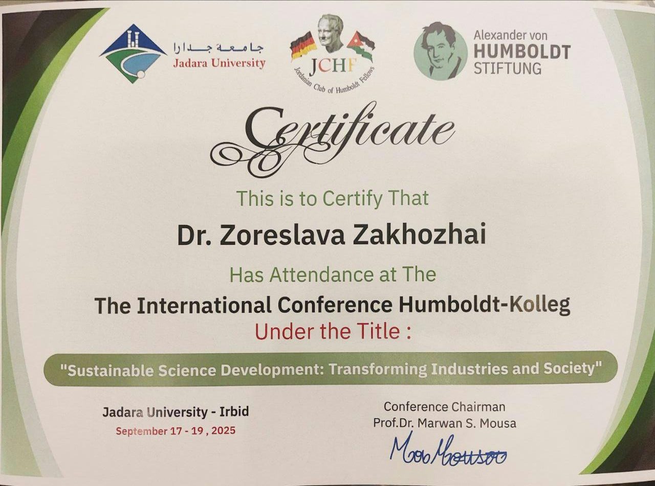 17-19 вересня 2025 в Йорданії відбуласьThe Іnternational Conference Humboldt-Kolleg«Sustainable Science DevelopmentTransforming Industries and Society»(Міжнародна наукова конференція «Сталий розвиток науки: трансформація промисловостіі суспільства»), яку організував Jordanian Clubof Humboldt Fellows & Jadara University.
