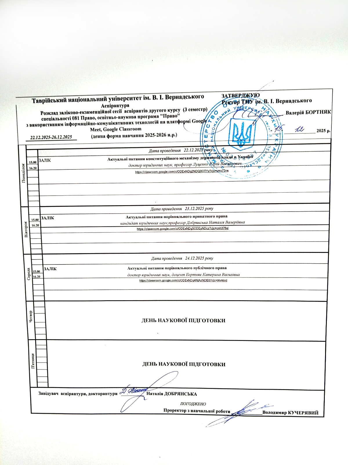 Розклад заліково-екзаменаційної сесії аспірантів другого курсу (3 семестр) спеціальності 081 Право, освітньо-наукова програма “Право” 3 використанням інформаційно-комунікативних технологій на платформі Google Meet, Google Classroom 22.12.2025-26.12.2025 (денна форма навчання 2025-2026 н.р.)