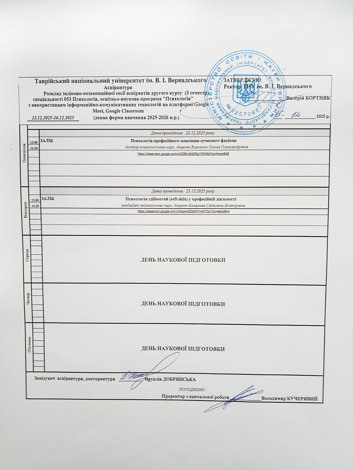 Розклад заліково-екзаменаційної сесії аспірантів другого курсу (3 семестр) спеціальності 053 Психологія, освітньо-наукова програма “Психологія” з використанням інформаційно-комунікативних технологій на платформі Google Meet, Google Classroom 22.12.2025 – 26.12.2025 (денна форма навчання 2025-2026 н.р.)