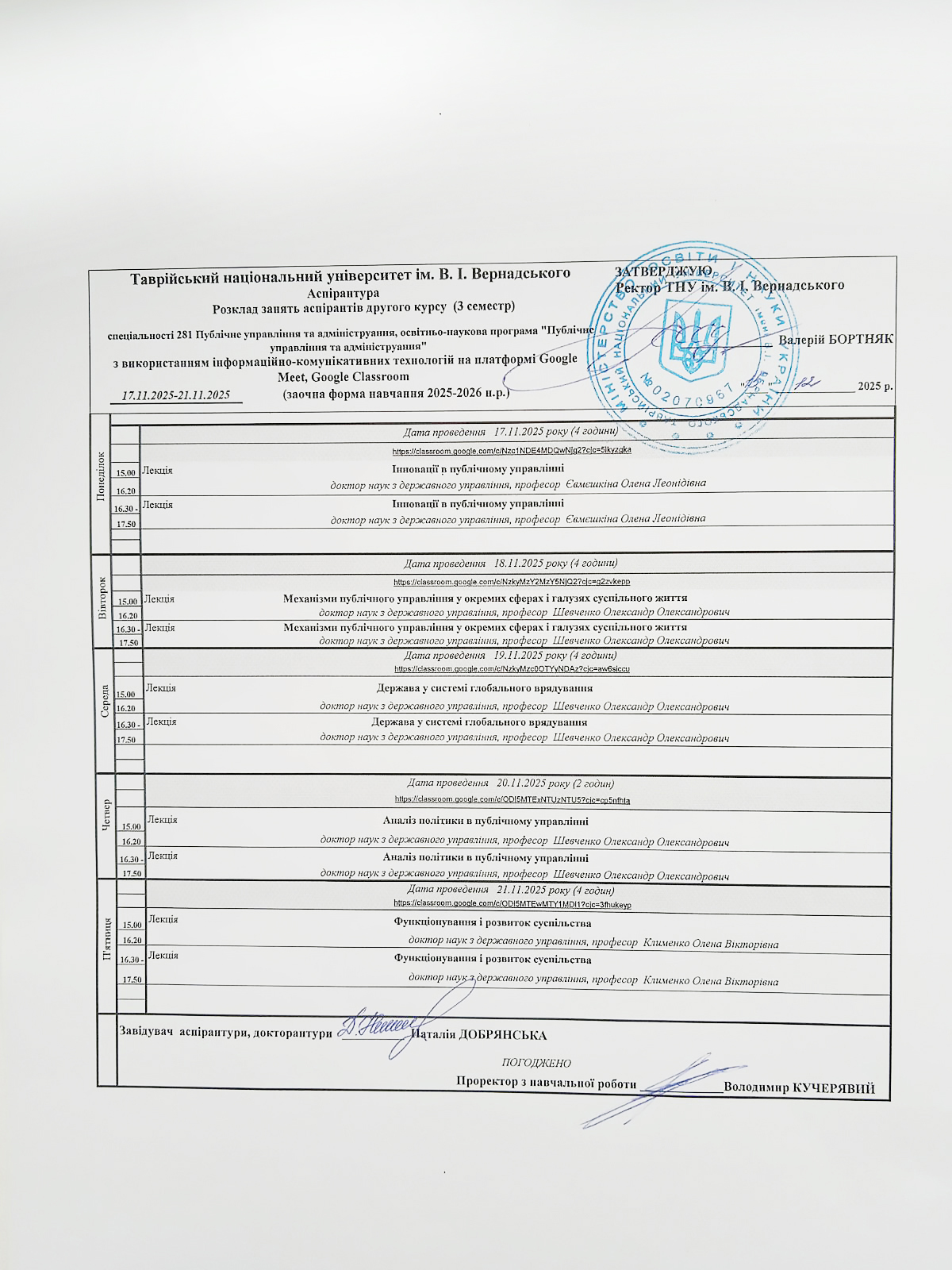 Розклад занять аспірантів другого курсу (3 семестр) Публічне управління та адміністрування з використанням інформаційно-комунікативних технологій на платформі Google Meet, Google Classroom 17.11.2025-21.11.2025 (заочна форма навчання 2025-2026 н.р.)