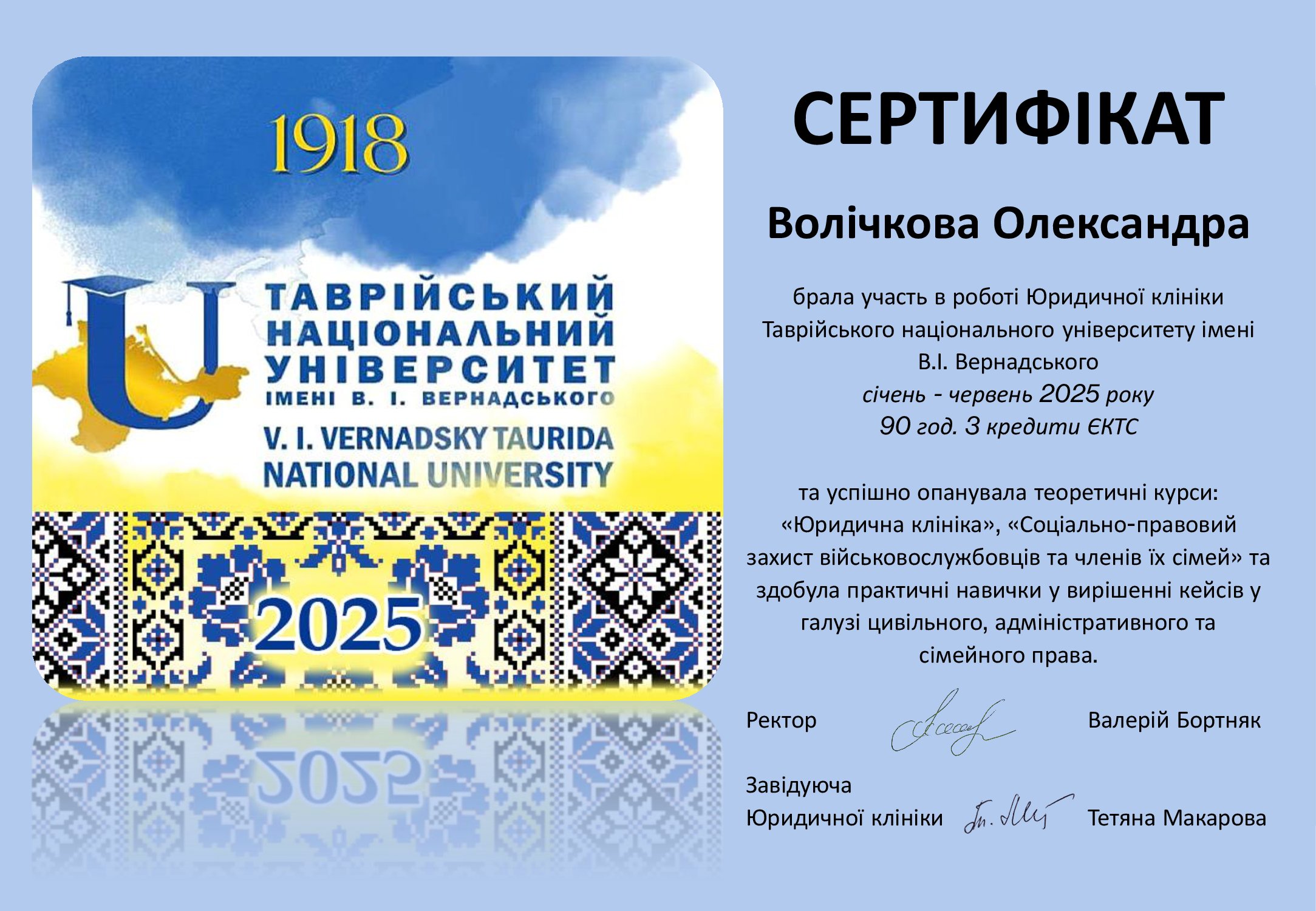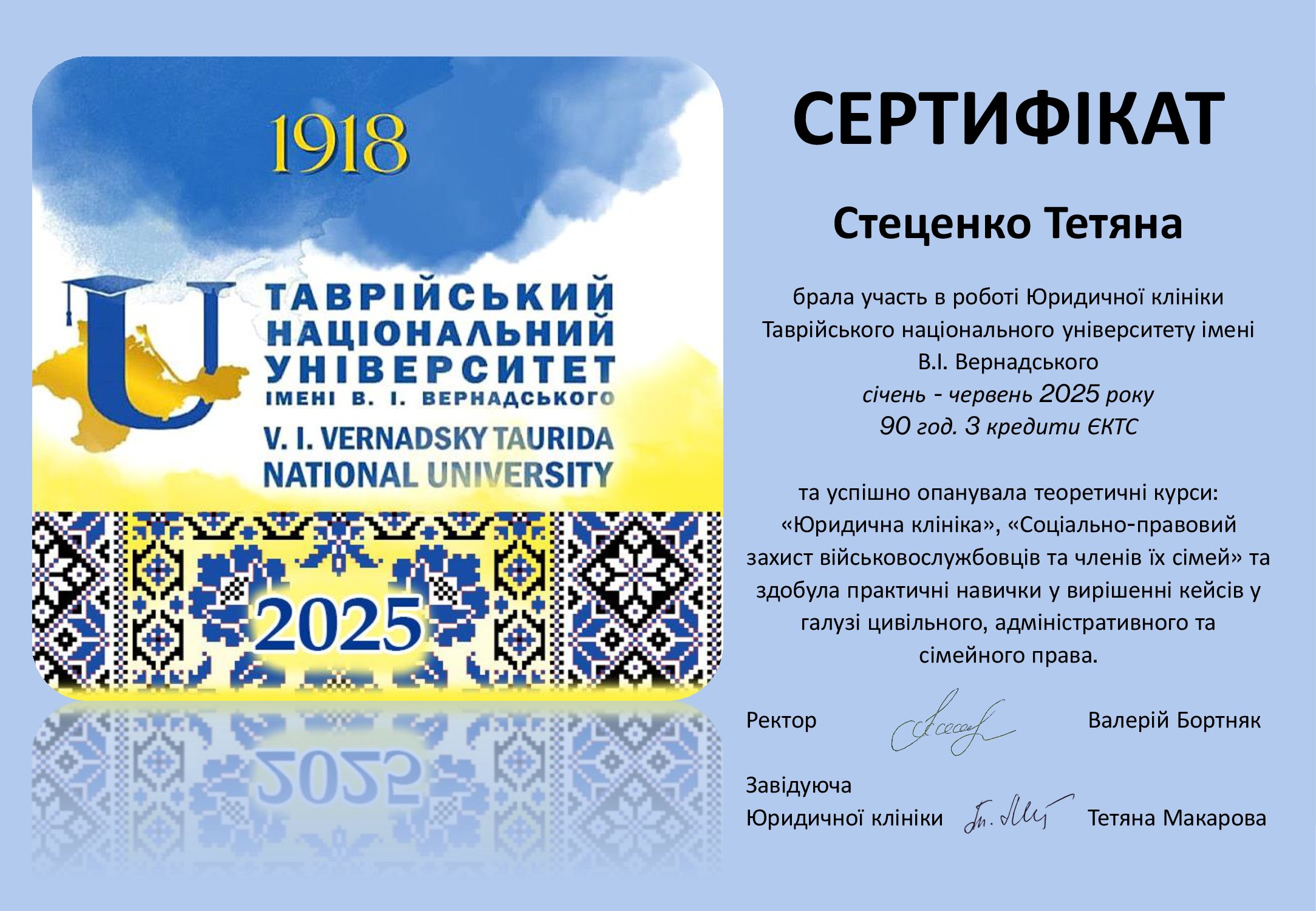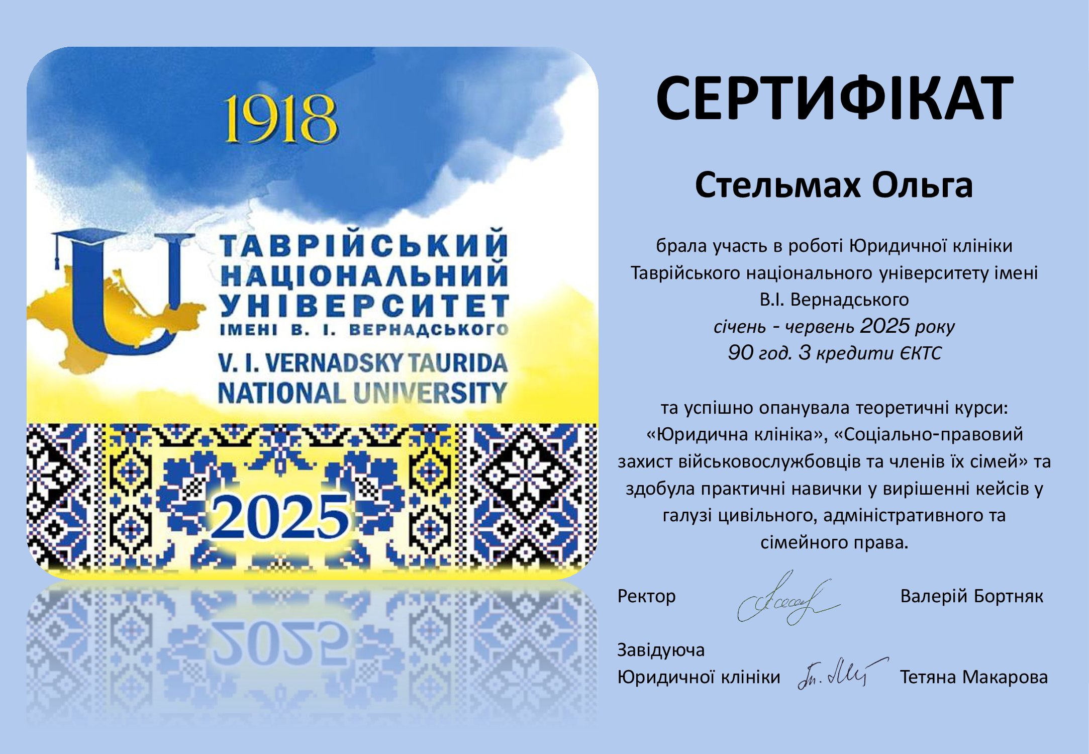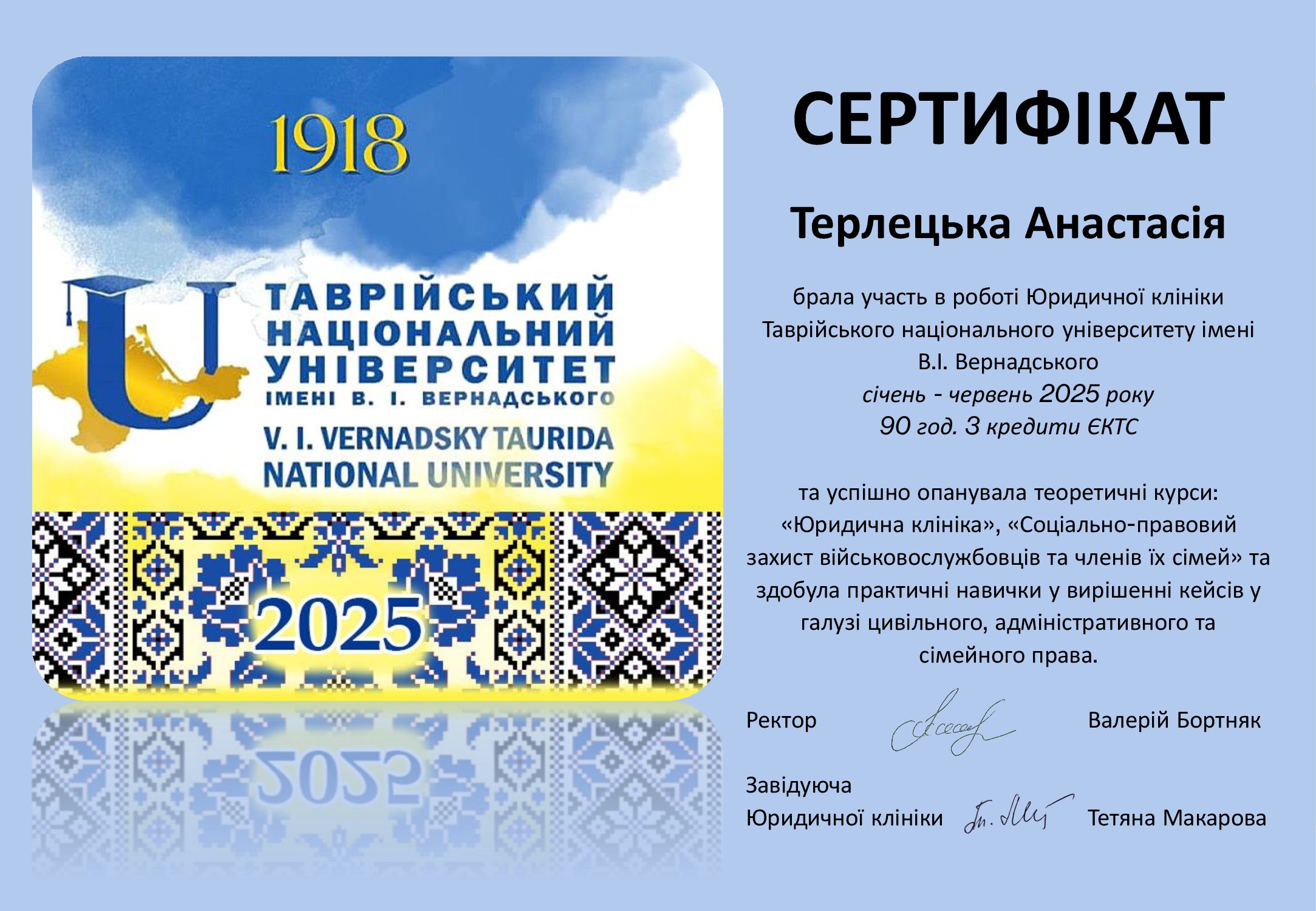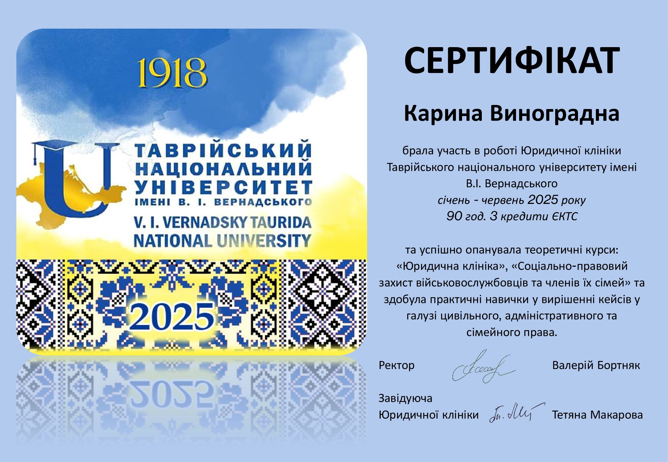 Сертифікати клініцистів Теоретичні курси: «Юридична клініка», «Соціально-правовий захист військовослужбовців та членів їх сімей» та здобула практичні навички у вирішенні кейсів у галузі цивільного, адміністративного та сімейного права. (Січень – червень 2025 р.)