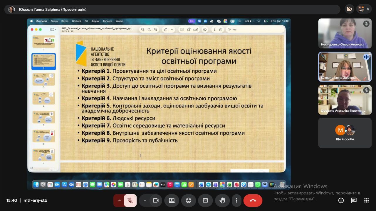 Під час засідання було наголошено, що глибоке розуміння та правильне застосування саме цих базових критеріїв є фундаментом успішного проходження акредитації. Оскільки проєктування та зміст програми є першочерговими об’єктами експертної оцінки, робота гарантів у цьому напрямі має бути максимально вивіреною та аргументованою.