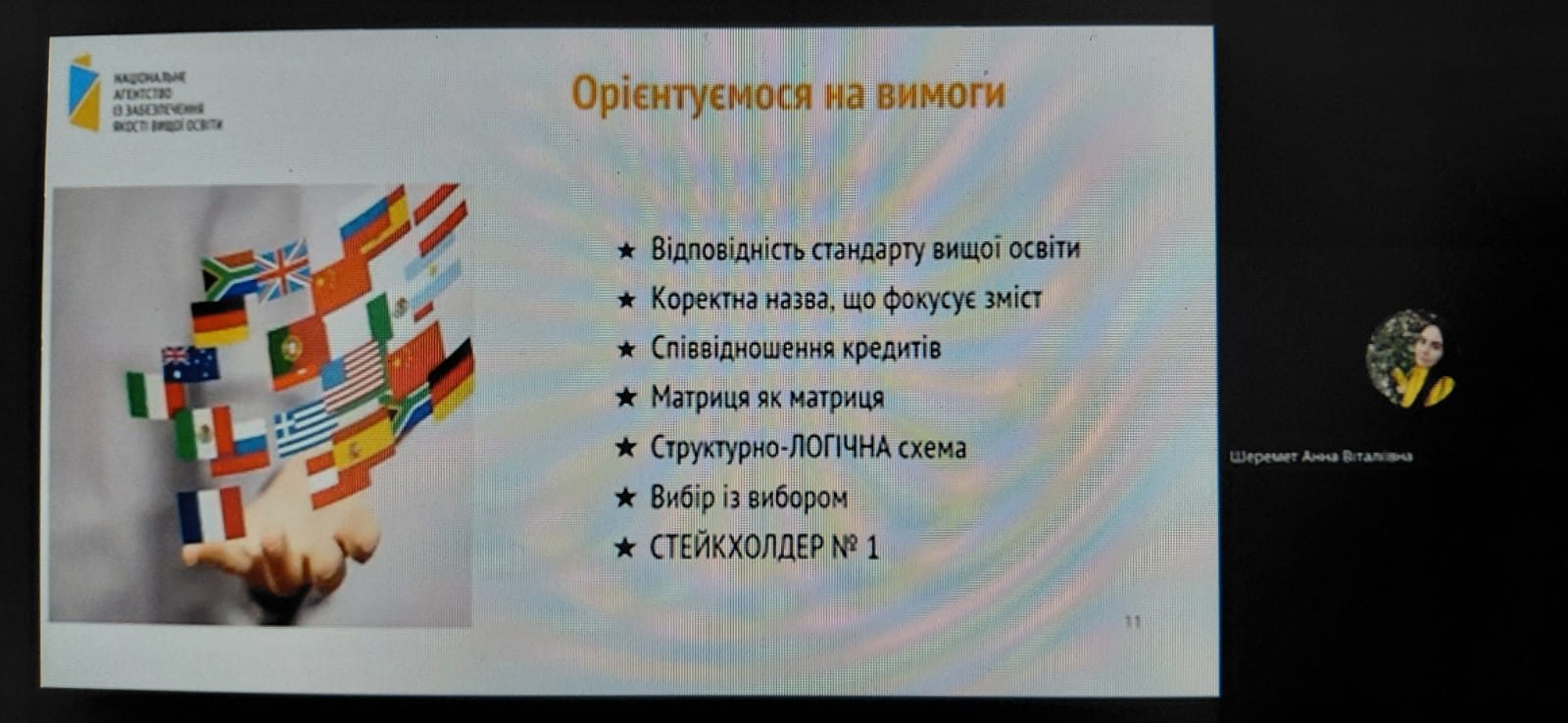 У своїй доповіді лектор зосередила основну увагу на детальному розборі перших двох розділів посібника «Роз’яснення щодо застосування Критеріїв оцінювання якості освітньої програми» від НАЗЯВО: