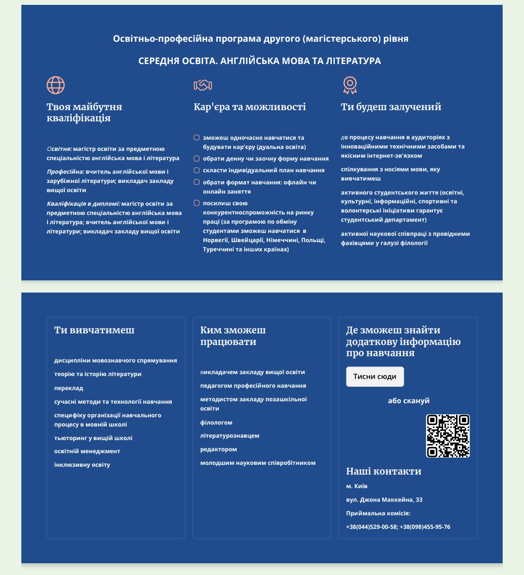 На завершення було представлено дві освітньо-професійні програми другого (магістерського) рівня освіти «Середня освіта. Англійська мова та література», гарантом якої є к. філол. н., доц. Катерина Хома та «Англійська мова і література та переклад, німецька мова» (гарант – д. філол. н., проф. Наталія Іщенко). Унікальність першої – спрямованість на підготовку фахівця закладу освіти. Вибірковий блок освітньо-професійної програми підсилює професійну підготовку, готує здобувачів до викладання англійської мови в закладах загальної середньої освіти, позашкільних закладах освіти та закладах вищої освіти. Педагогічні спеціальності, як зазначила гарант програми, мають особливу підтримку, тому в абітурієнтів, які обирають цей фах, є можливість при вступі взяти участь у конкурсі на бюджетні місця. ОПП «Англійська мова і література та переклад, німецька мова» відкриває можливість залучення здобувачів освіти до подій у науковому житті України та за її межами. ОПП передбачає оволодіння двома мовами, реалізацію перекладацької діяльності, а вивчення дисциплін літературознавчого спрямування в її межах спрямоване на розкриття творчого потенціалу здобувачів.